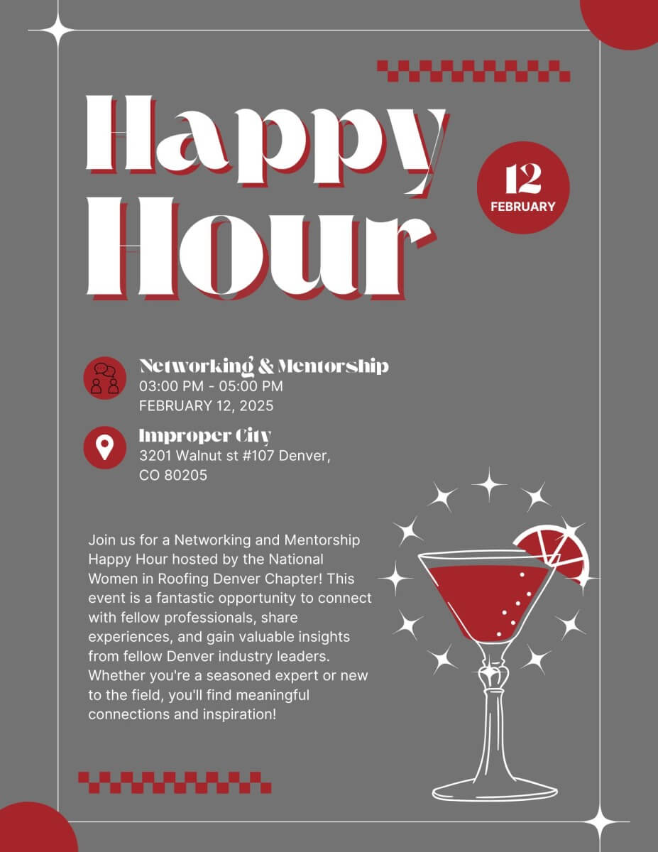 Join us for a Networking and Mentorship Happy Hour hosted by the National Women in Roofing Denver Chapter! This event is a fantastic opportunity to connect with fellow professionals, share experiences, and gain valuable insights from fellow Denver industry leaders. Whether you're a seasoned expert or new to the field, you'll find meaningful connections and inspiration!