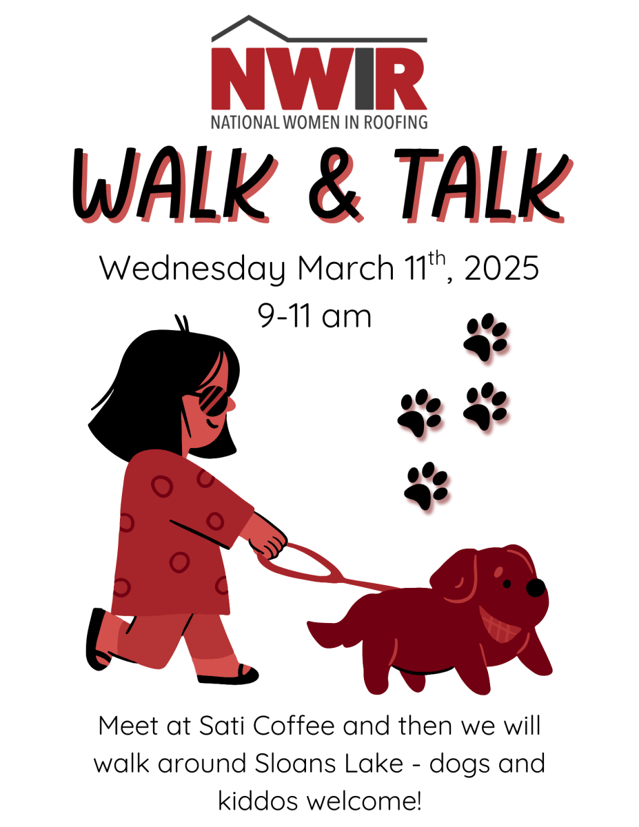 Join the NWIR Denver Council for a casual morning of connection, fresh air and great conversation at our Walk & Talk! We’ll meet at Sati Coffee, grab a drink or snack and then enjoy a relaxed walk around Sloan’s Lake. This is a laid-back opportunity to network, catch up with fellow women in roofing and start your day on a positive note. Dogs and kiddos are welcome, so bring the whole crew. We can’t wait to see you there!