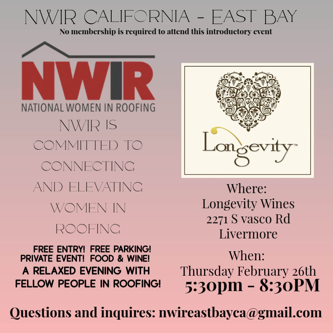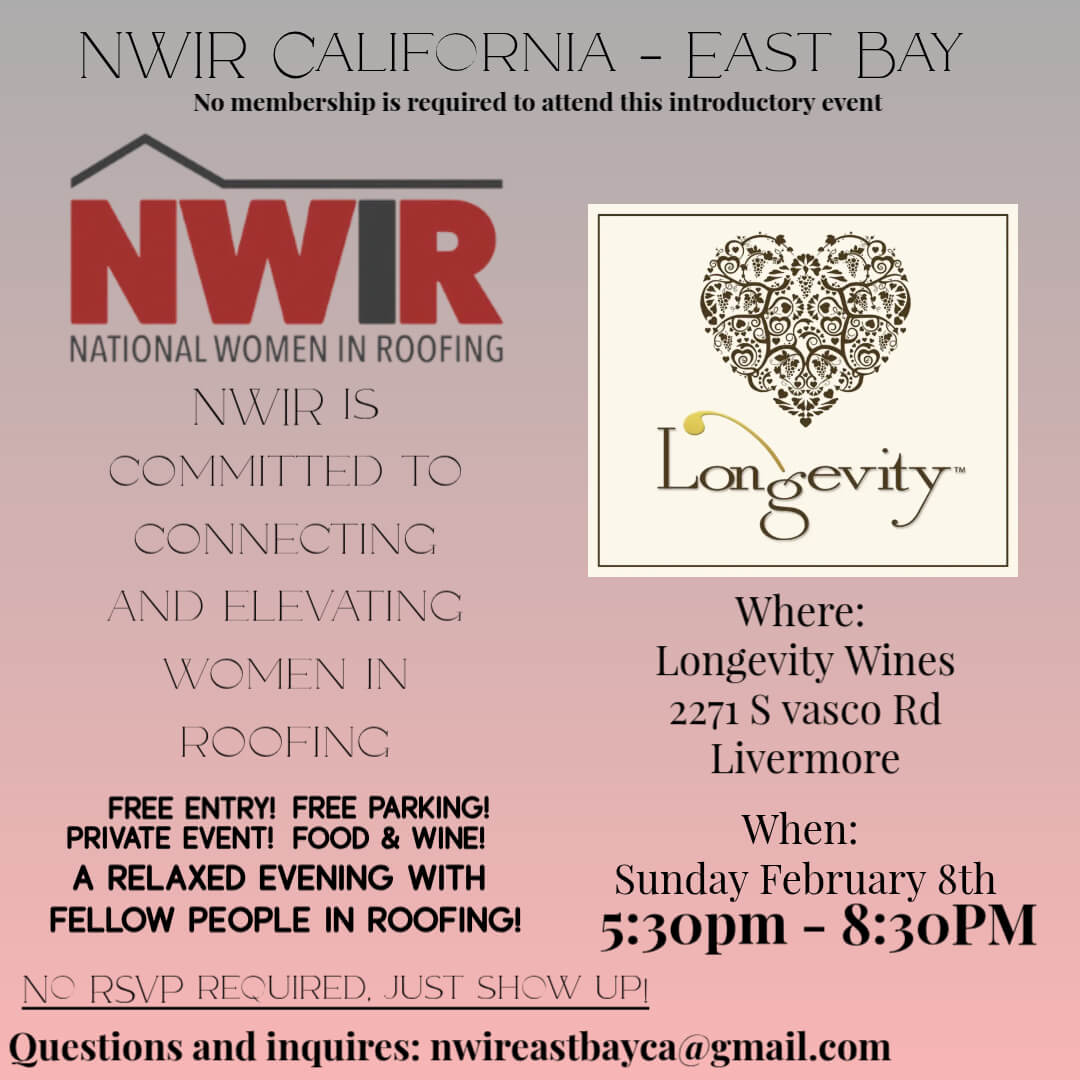 Join us for the very first National Women in Roofing East Bay event, a relaxed and welcoming private gathering at Longevity Wines in Livermore.