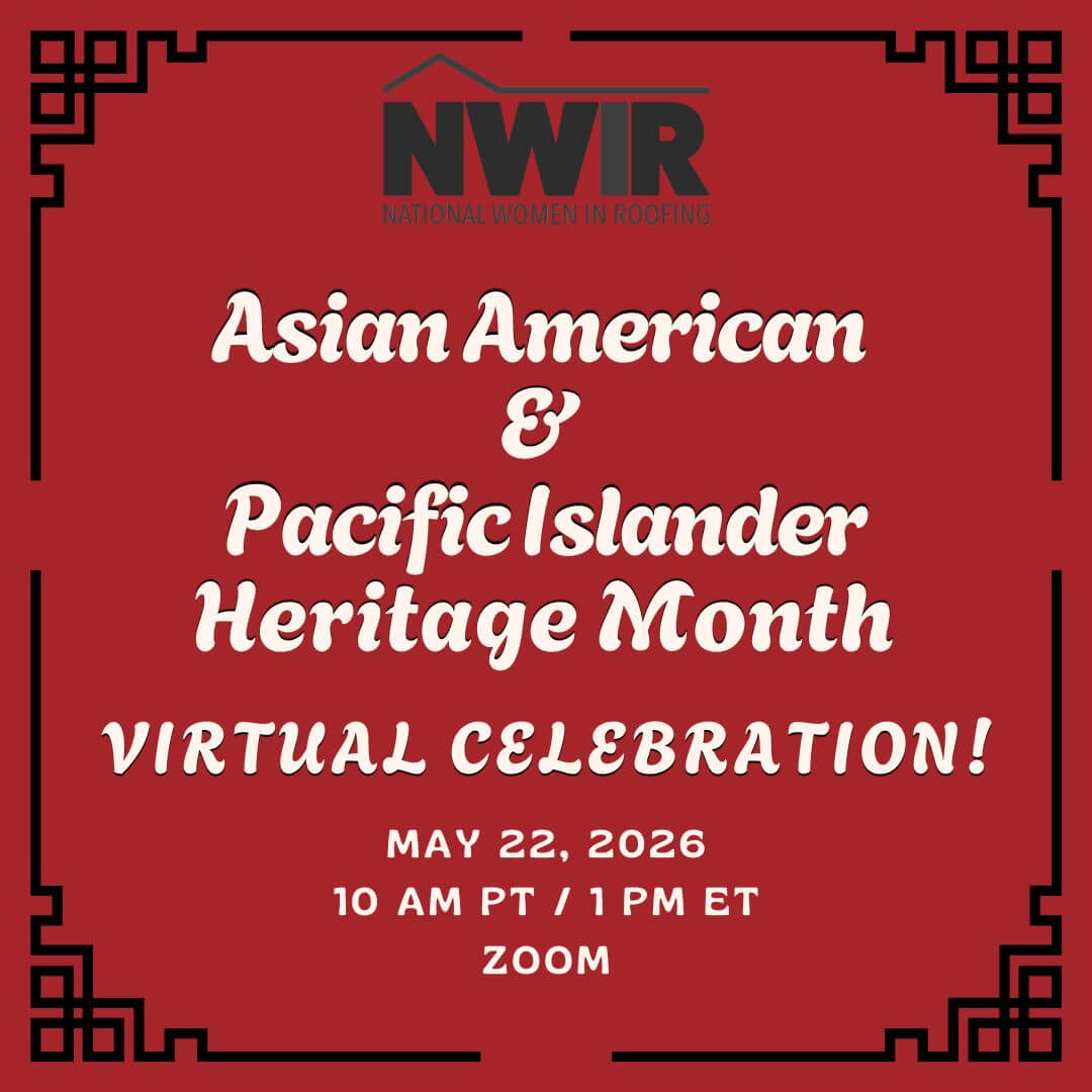 Join National Women in Roofing for a special NWIR DEI AAPI Month Virtual Celebration hosted by our DEI Committee. Click the REGISTER NOW button above to receive the Zoom link!